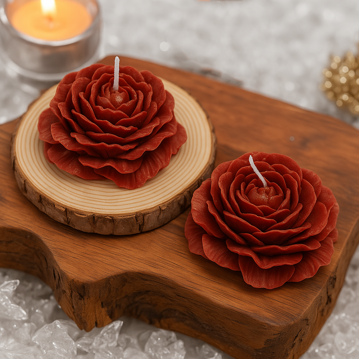A Vela em Formato de Rosa traz elegância e charme para qualquer ambiente com seu design delicado e sofisticado. Com detalhes cuidadosamente esculpidos, é uma peça que valoriza a decoração, seja em jantares, eventos especiais ou no dia a dia.